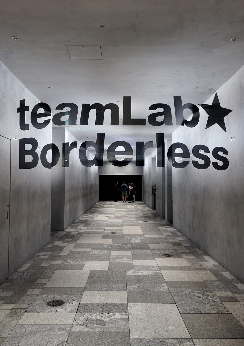 エントランスの指定位置でカメラをかざすと、「teamLab Borderless」の文字がフラットに現れる仕掛け。